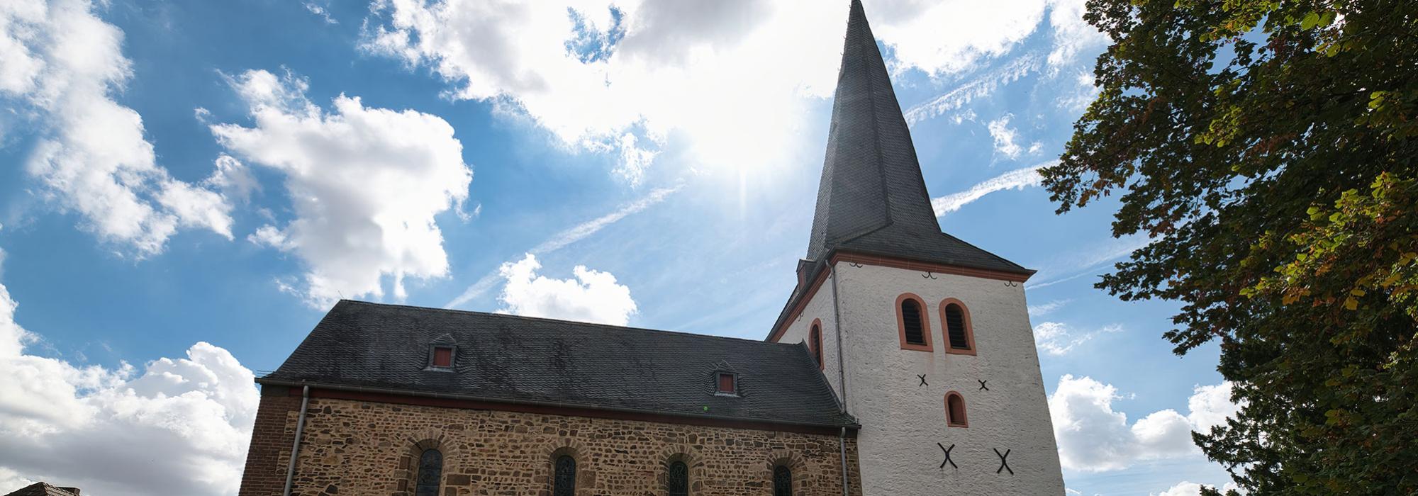 An der alten kath. Pfarrkirche, oberhalb der in der Erftniederung gelegenen Burg, kann im Baubefund nur eine einschiffige Saalkirche aus dem 10./11. Jh. nachgewiesen werden. Diese wurde im 12. Jh. zu einer vierjochigen Basilika mit zwei Seitenschiffen und Apsis erweitert. Wahrscheinlich entstand gleichzeitig der ungegliederte, in der Turmhalle tonnengewölbte, viergeschossige Westturm mit allseitig paarig angelegten, rundbogigen Schallöffnungen im Glockengeschoss. In der Folgezeit wurde der Bruchsteinbau immer wieder verändert bzw. erneuert. 1743 entfernte man die flache Holzdecke und führte ein Kreuzrippengewölbe ein, wodurch das epitaphähnliche Relief - mit Christophorus-Darstellung - auf der Südwand in Höhe des Turmobergeschosses (Michaelskapelle bzw. ,,Herrengeschoss") verdeckt wurde. 1812 errichtete man einen neuen (Polygonal-)Chor mit 5/8 Schluss. 1860 wurde die Orgelempore - aus Holz - in Fortsetzung des Turmobergeschosses eingefügt, damit die Gebrüder Müller aus Reifferscheidt/Eifel darauf ihre Orgel installieren konnten. 1885 erneuerte bzw. verbreiterte man die Seitenschiffe in Backsteinmauerwerk und erweiterte den Chor, woran man Sakristeibauten als Verlängerung der Seitenschiffe beidseitig anlehnte. 1938 baute Karl Bach aus Aachen auf der erweiterten Empore eine neue Orgel ein.